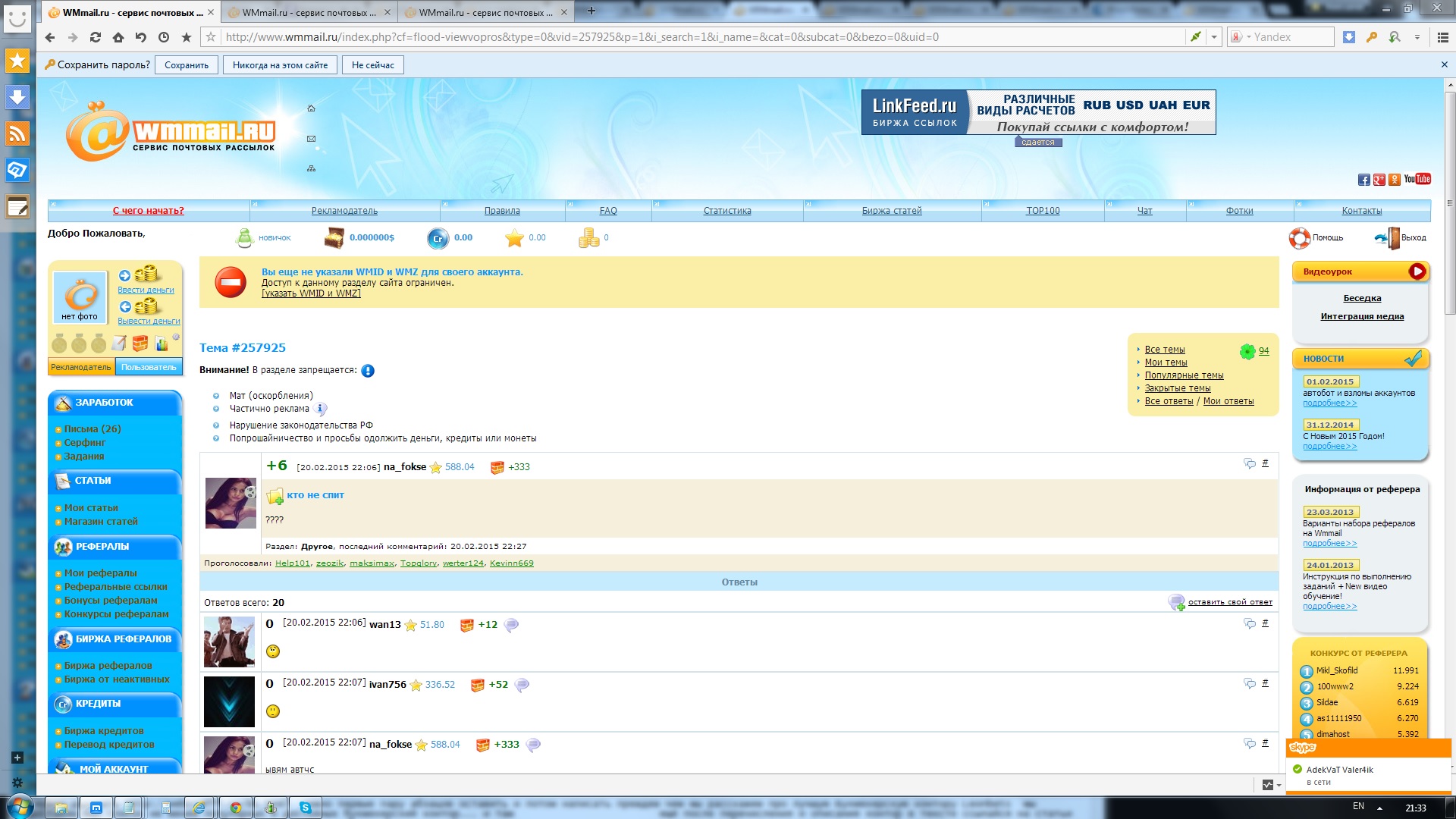 Так же, пока пользователь не укажет WMID и WMZ, он не будет иметь доступ к разделам общения, перевода средств между аккаунтами, биржи рефералов и т.п.